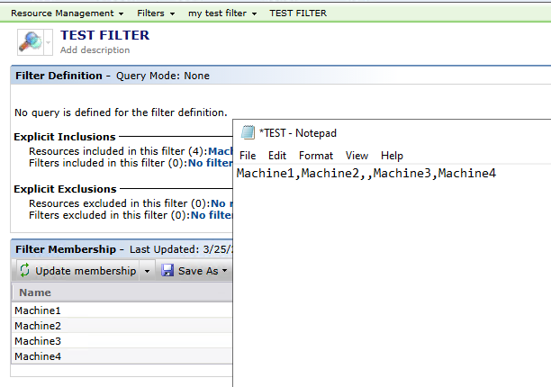 Convert the list of machine names into a comma-separated format before importing the file into the filter.
