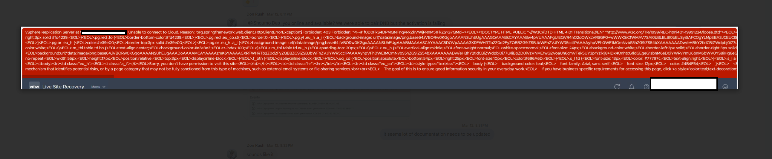 The Live Site Recovery dashboard displays the below error: