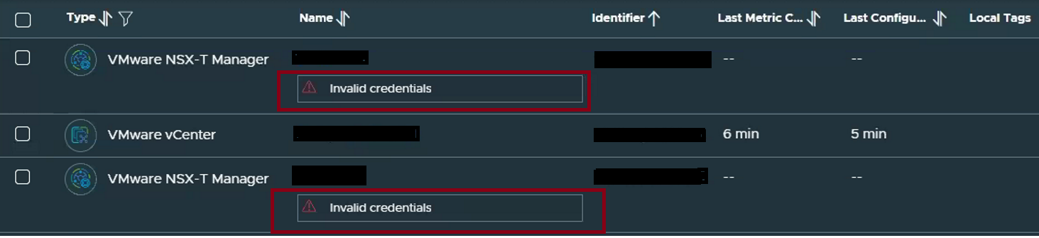 [YYYY-MM-DDTHH:MM:SSZ] <Collector-IP> <NSX-IP> "GET" "/api/v1/node" "HTTP/1.1" 403 UAEX...[YYYY-MM-DDTHH:MM:SSZ] <Collector-IP> <NSX-IP> "POST" "/api/session/create" "HTTP/1.1" 403 UAEX...Aria Operations for Networks shows "Invalid credentials" status for the NSX-T data sources.