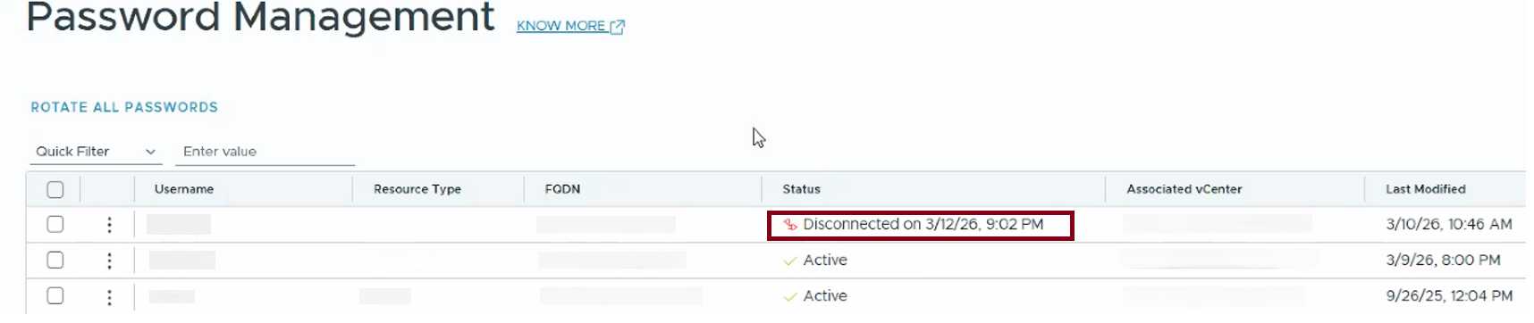 In the SDDC Manager UI, the Password Management section displays a "Disconnected" status for Workspace ONE (WS1)/vIDM admin account.