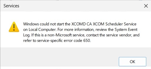 An XCOM service was created but fails to start with message:Windows could not start the XCOMD CA XCOM Scheduler serviceon Local Computer. For more information review the System EventLog. If this is a non-Microsoft service, contact the service vendor, and referto service-specific error code 650.