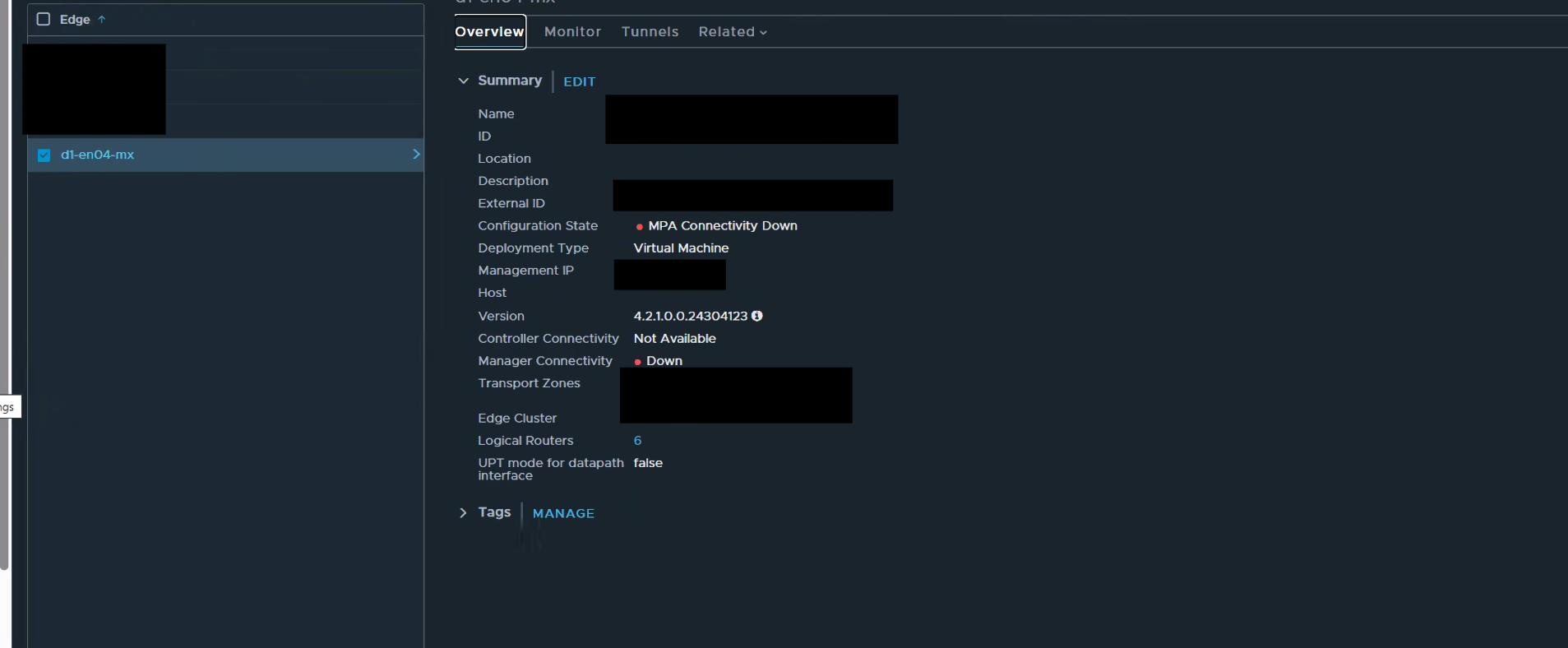 The Edge Virtual Machine was manually deleted directly from the vCenter Server inventory.