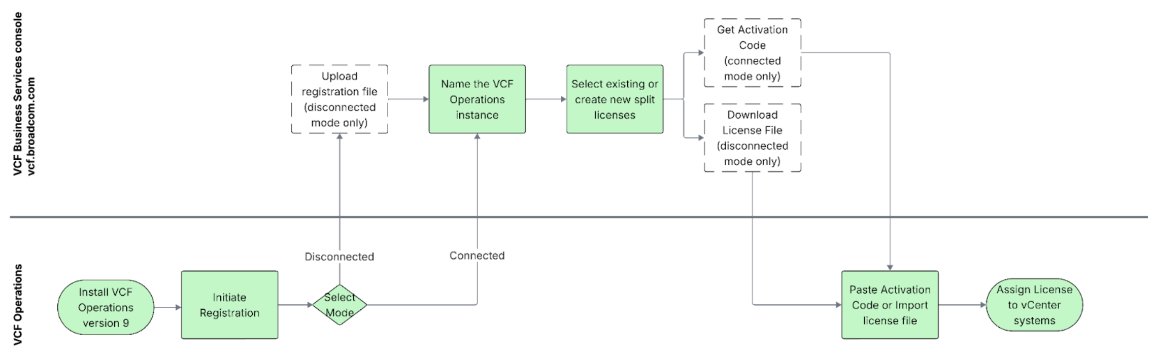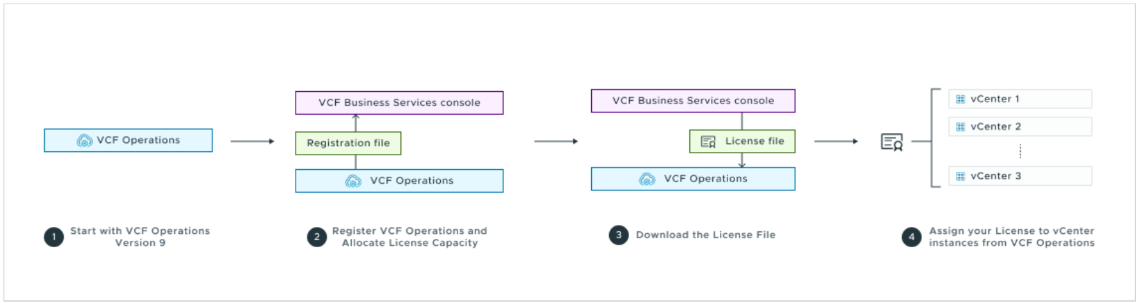 - Disconnected Mode: After registration you will receive a license file that can be imported into your VCF Operations instance.