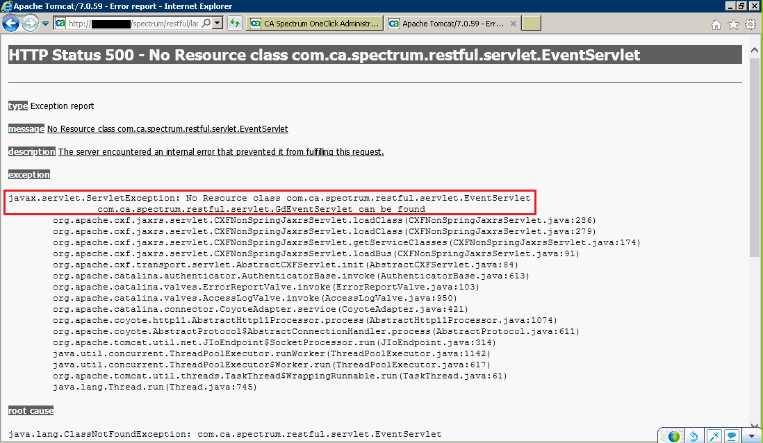 If you try to open the following URL you will get the same kind of error: "HTTP Status 500 - No Response class com.ca.spectrum.restful.servlet.EventServlet"