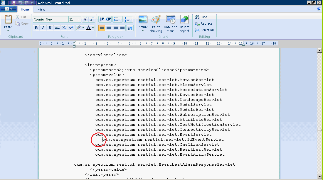 When you open the $SPECROOT/tomcat/webapps/spectrum/WEB-INF/web.xml file in WordPad, you notice the column is not aligned for the GdEventServlet entry.
