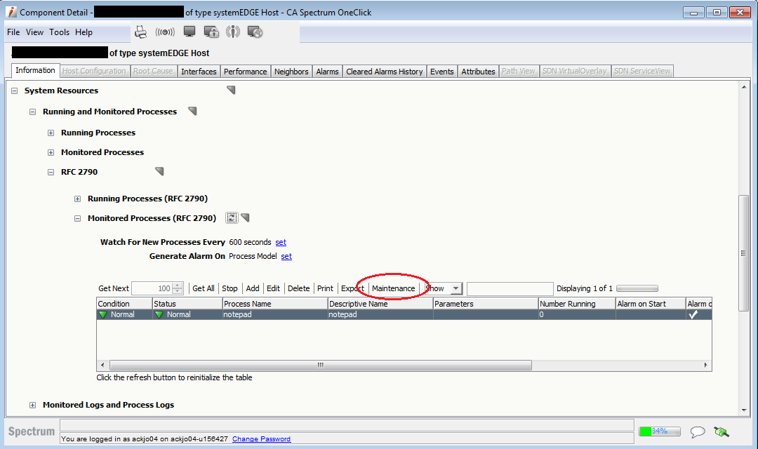 Placing a Monitored Process in Maintenance Mode from the Spectrum OneClick System Resources -> Running and Monitored Processes -> RFC 2790 -> Monitored Processes (RFC 2790) subview does not show the username in the event logged.