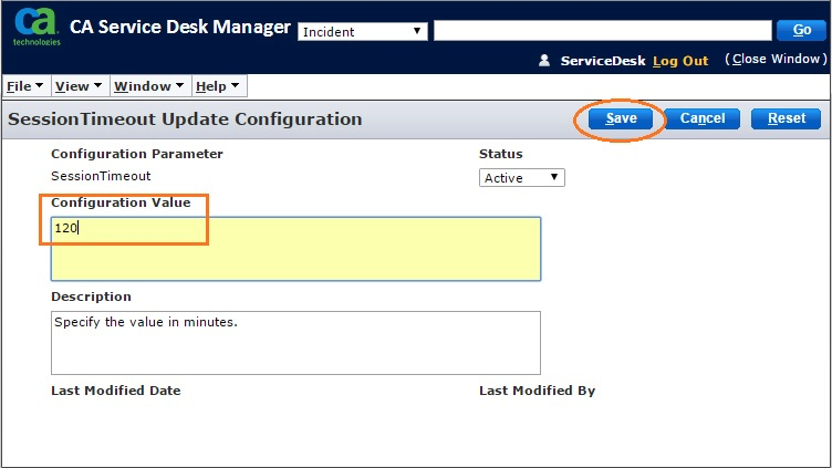 Replace the default Configuration Value "60" with the desired value (in minutes). In this example, type "120" (this will change the session timeout to 2 hours) . Click on "Save" button.