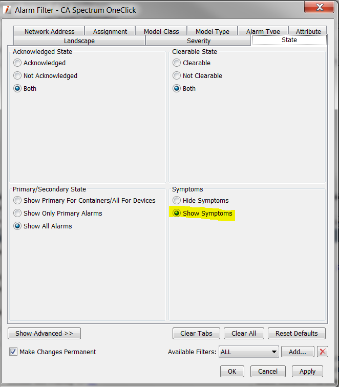 You may also want to adjust the Alarm Filter options for the users to show symptom alarms in the Alarm Tab. This can be done in OneClick by opening the Alarm Filter dialog widow, select the State Tab and set "Symptoms" to "Show Symptoms".