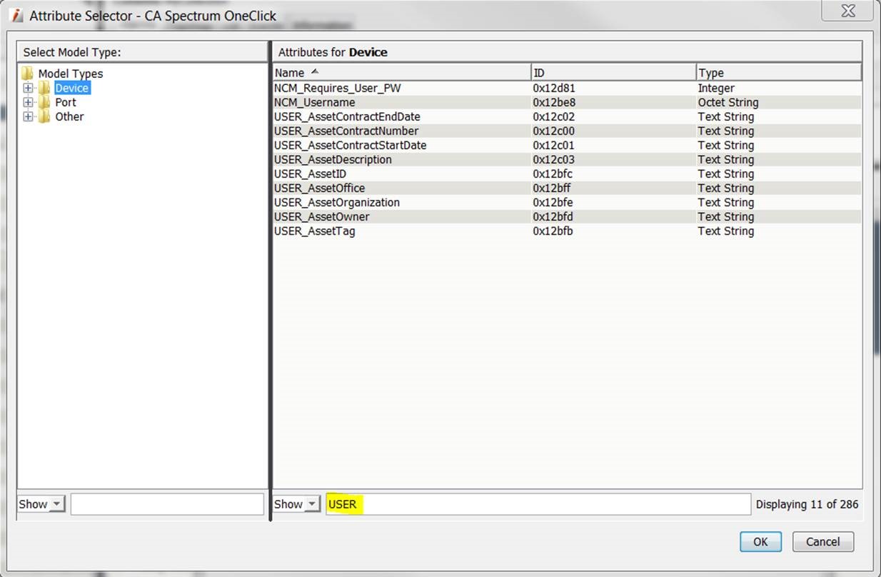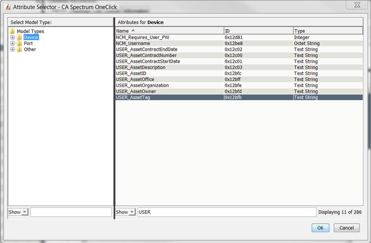 Since you are wanting to use the “User_AssetTag” attribute (0x12bfb), you should be able to simply filter on “USER”, by entering USER in the Show field under the Attributes portion of the view, to see all the USER_ attributes. The USER_ attributes are generally universal for all model types.