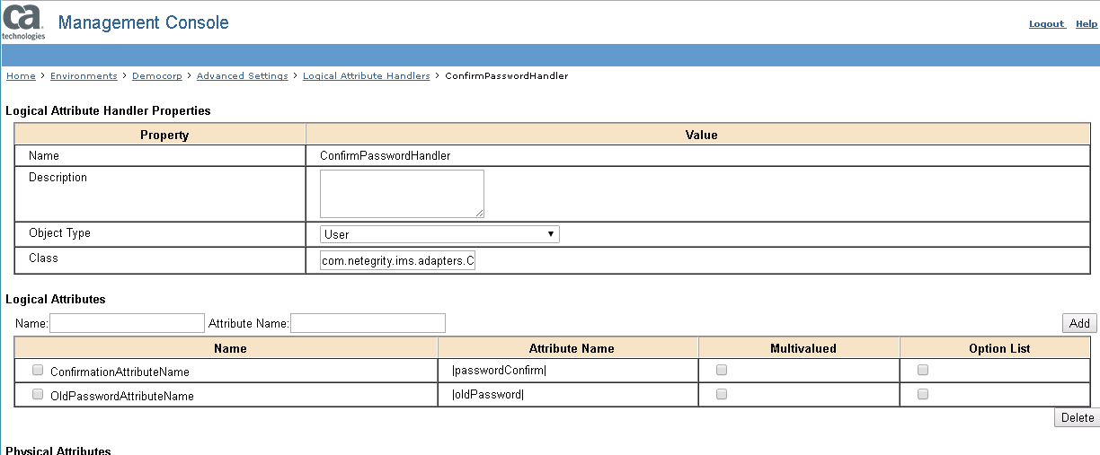 By default in an Identity Manager install, the "ConfirmPasswordHandler" is configured. To see this, login to the Management Console and browse to Environments>Your Environment>Advanced Settings>Logical Attribute Handers> ConfirmPasswordHandler. You will see the following: