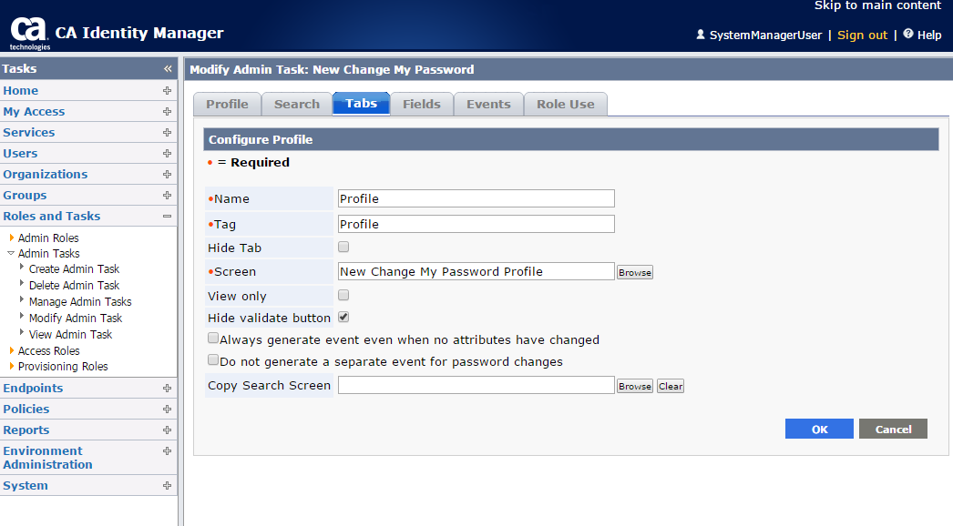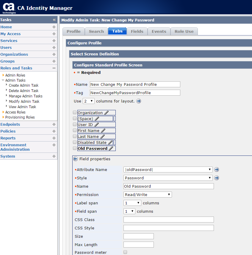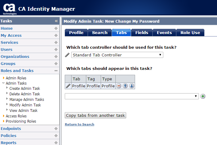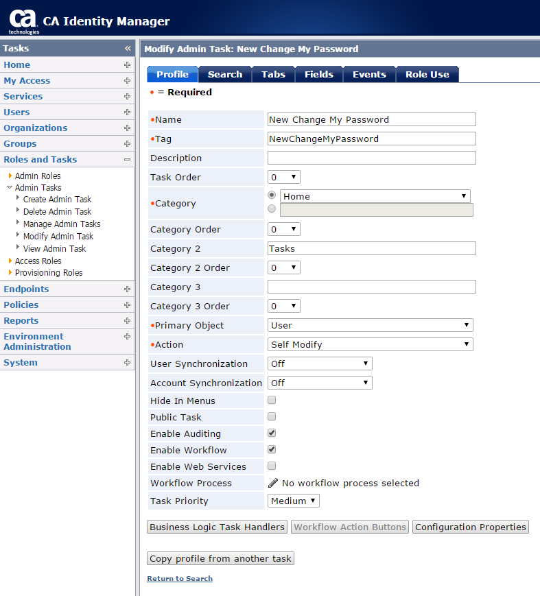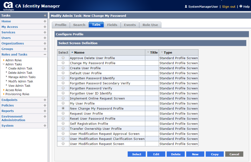 Notice the attribute name above is |oldPassword|. This is the attribute we need to add to the screen for the Change My Password task. To do this, login to the Identity Manager GUI as an administrator. Browse to the task you want to modify (in our case "Change My Password") and it is suggested that you make a copy of this task to modify. To do this, select to create a new task and you will be prompted to copy an existing task.