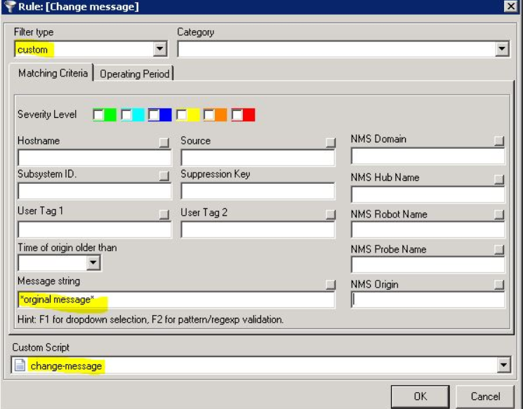 3. Go to the NAS pre-processing rules tab and create a rule that looks for the alarms with the message you want to change and set Filter type to ‘custom’ and choose the custom script ‘change-message’.