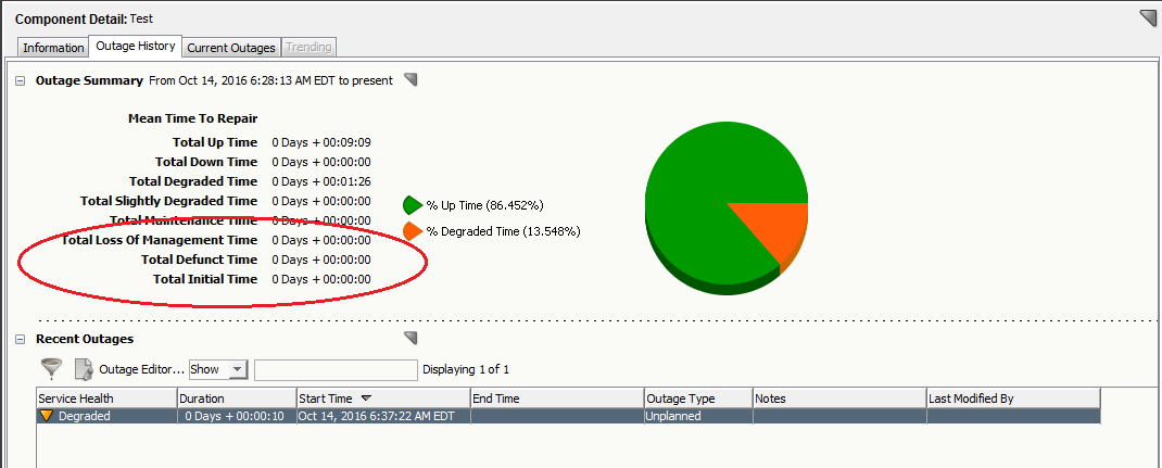 In the Outage Summary subview in the Outage History tab of the Spectrum OneClick Service Dashboard, what does "Total Loss Of Management", "Total Defunct Time" and "Total Initial Time" represent?