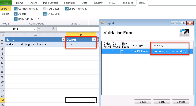 When attempting an import from CSV or using the CA Agile Central Add-in for Excel, an error is thrown stating "User not found in cell"
