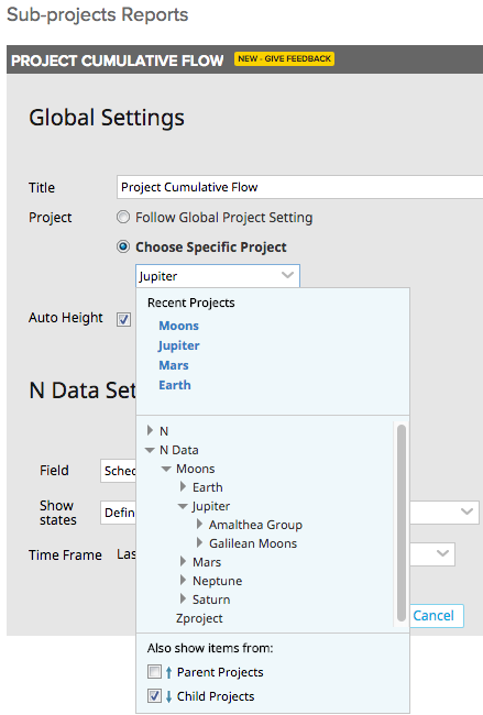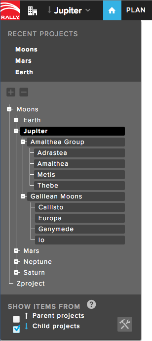 Go to the Setting under the app's gear menu to change the scope from the default global scope to a specific project. In this example our top project is Jupiter, and one of its child projects is selected: