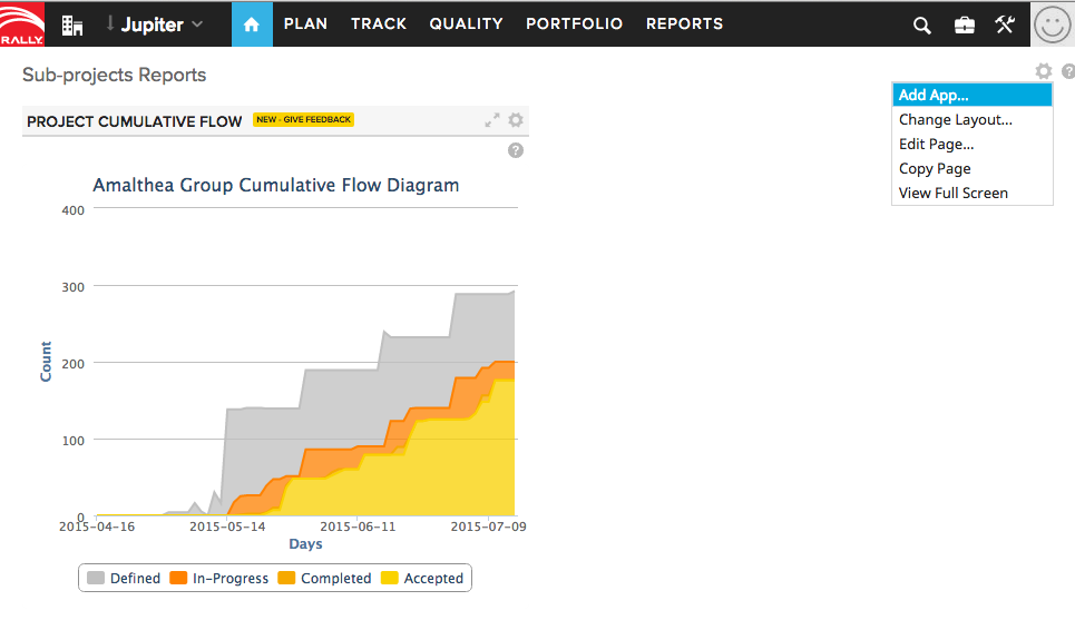 The app loads. Next we add the same Project Cumulative Flow Chart and set it's scope to a different child of the same parent project. Click on the gear icon for the entire page to access "Add App" menu item: