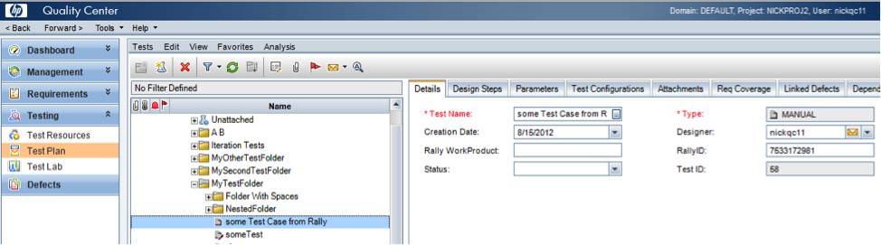 The test is created in QC. Notice the TS_USER_01 labeled ?RallyID? field populated with Object ID of the corresponding CA Agile Central test case:
