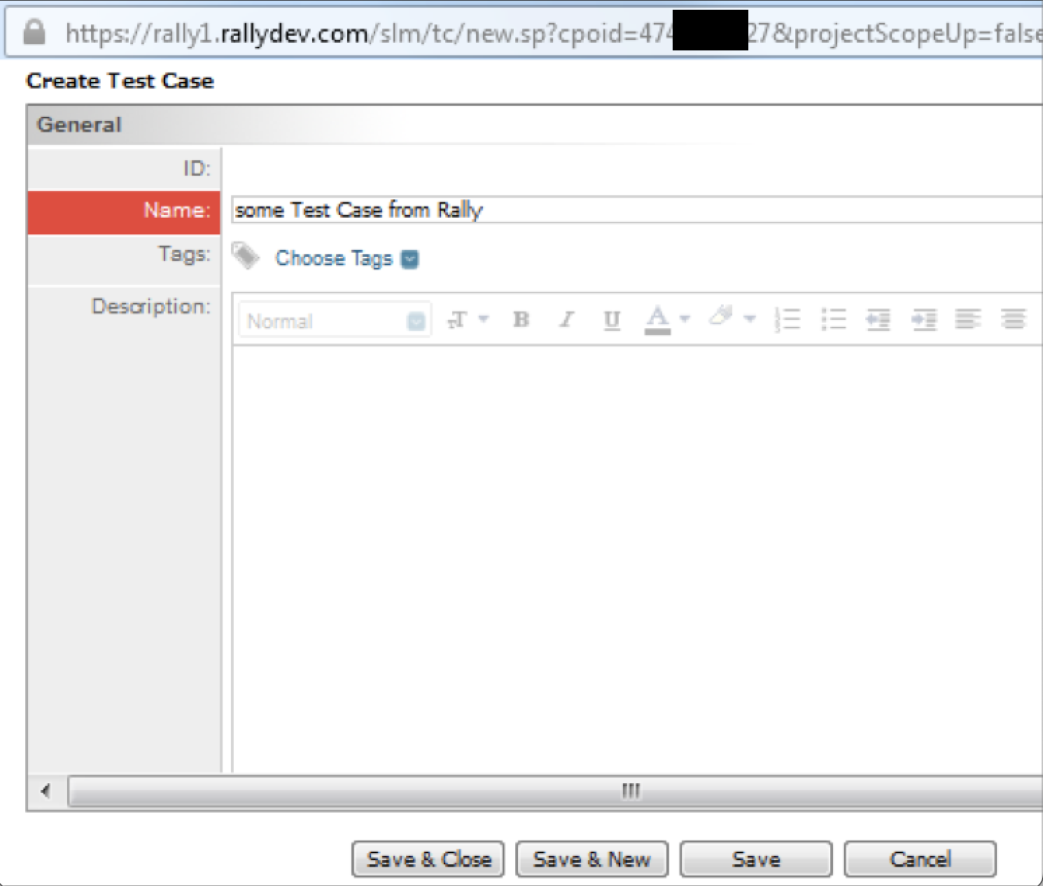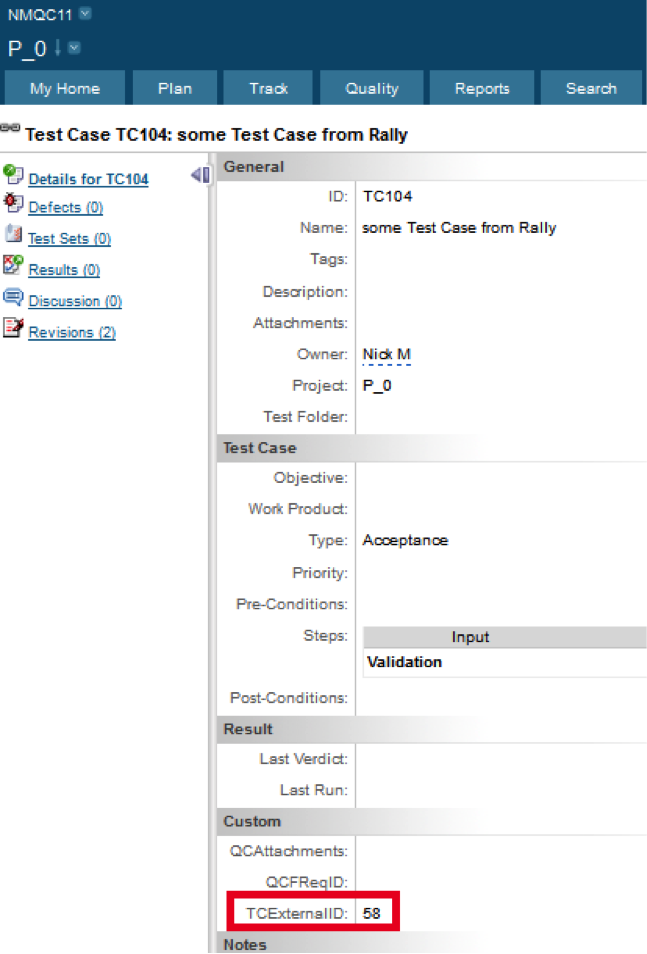 On the Rally side the original test case now has its custom field TCExternalID populated with the ID of the corresponding QC test: