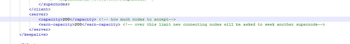 <capacity>200</capacity> <!-- how much nodes to accept--> <warn-capacity>200</warn-capacity> <!-- over this limit new connecting nodes will be asked to seek another supernode--> </server>