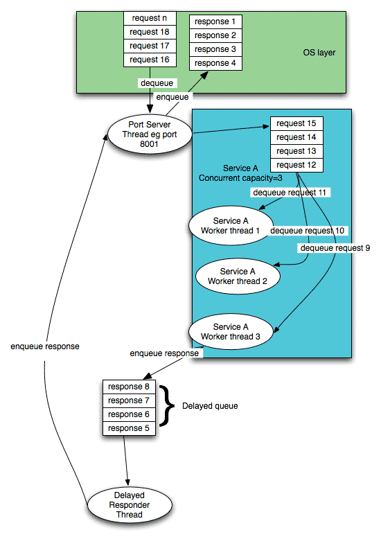 This diagram may or may not help ;-). Remember too, there can be two services listening on the same port but with different endpoints (e.g., 8001:/LisaTravel and 8001:/LisaBank). In which case there would be two blue blocks with two internal request queues but still only a single Port Server thread servicing port 8001. But these guys are very, very quick. Outrageously quick (we have measured 13,000 request response pairs per second on a Mac Pro for one java port server thread) and if we ever get there we can add more threads per port but the VSE will bottleneck before then.