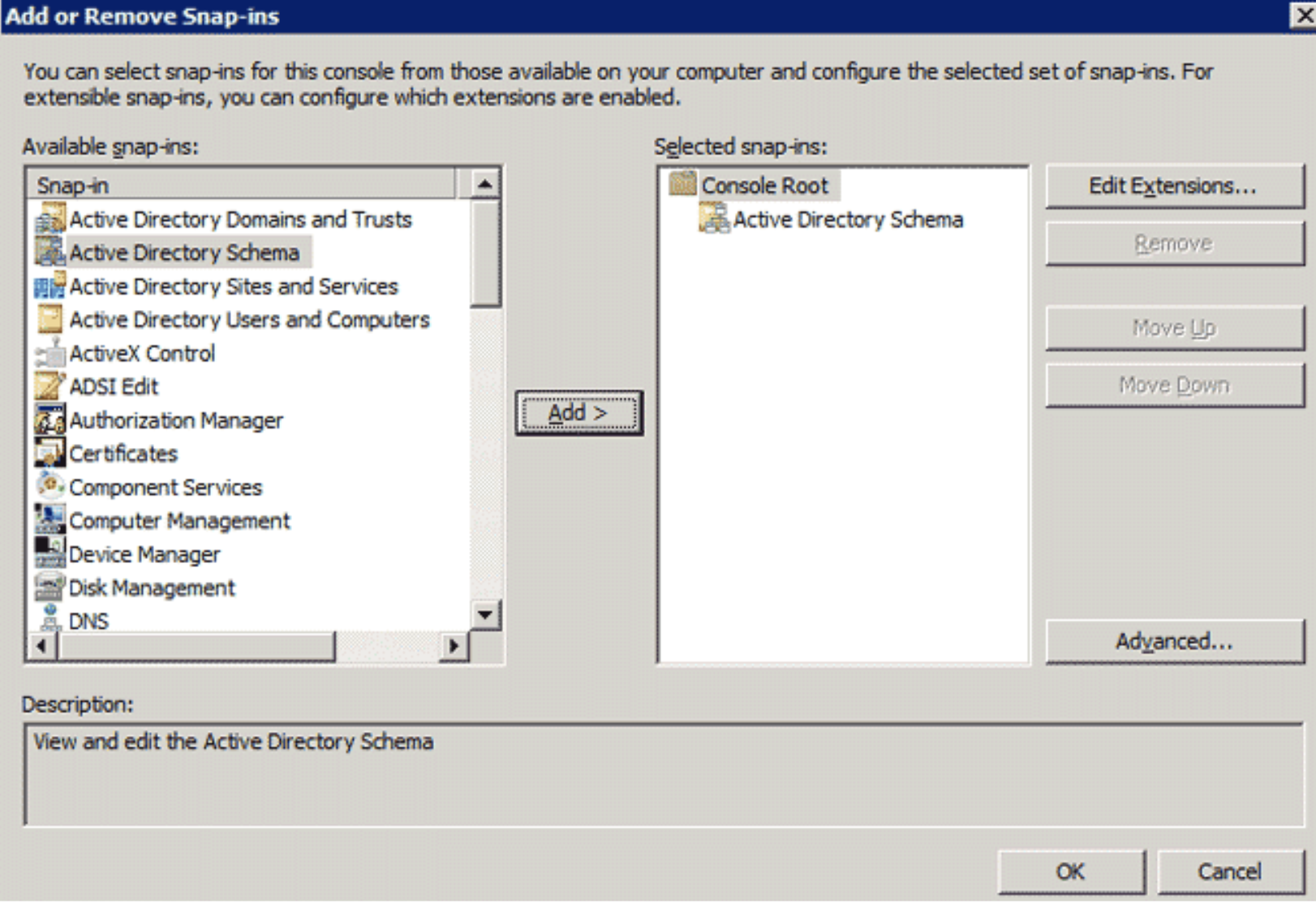 Note: If you receive an access permission error, check to make sure you are a member of the Schema Admins group, you have run the Console as administrator, and if necessary log off/on to the DC again. If necessary, disable UAC on the system for the time being.