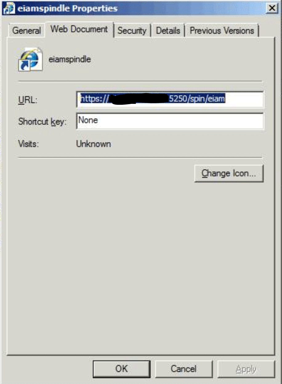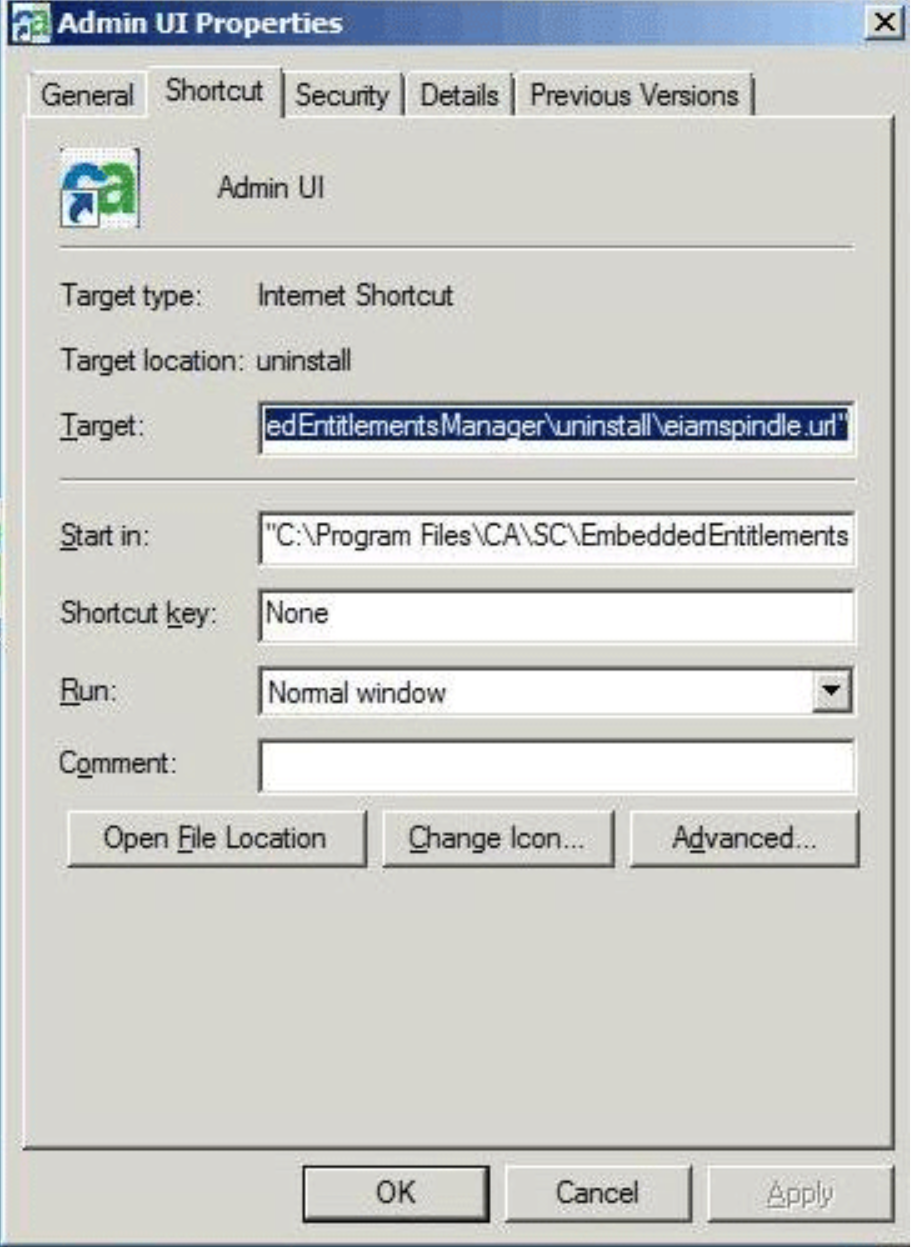 So we navigate to C:\Program Files\CA\SC\EmbeddedEntitlementsManager\uninstall and right click and select Properties of this file (eiamspindle, type=Internet Shortcut) And on the "Web Document" tab: