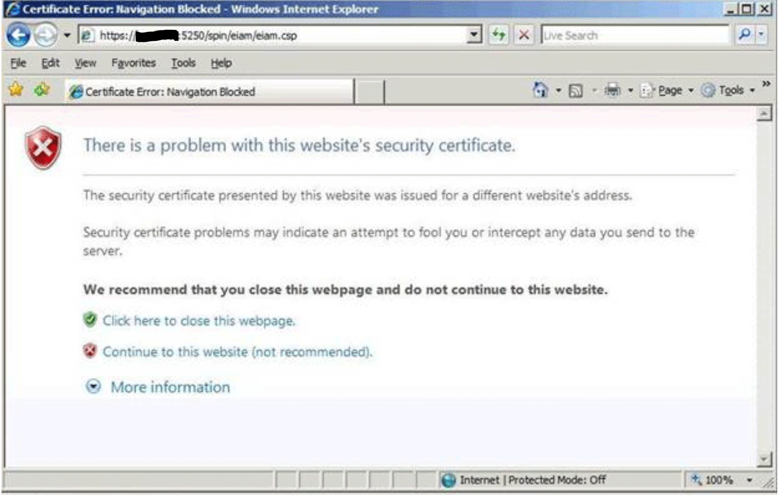 When opening the url https://<Hostname>:5250/spin/eiam/eiam.csp by default people see this error even if they have imported the certificate properly.