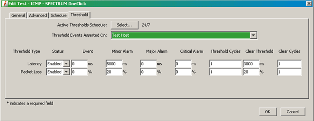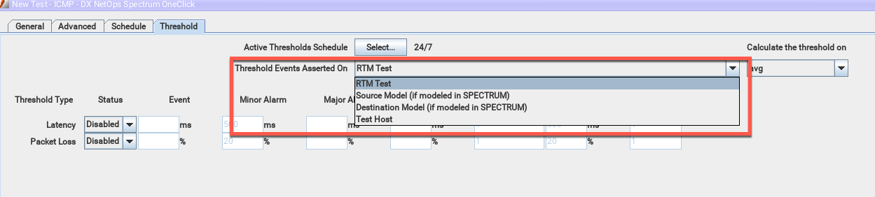 SPECTRUM is functioning as designed. SPM test timeout alarm is not a Threshold alarm. The configuration to assert Threshold Events on the Test Host model will assert violated Threshold Events or Alarms on the Test Host. However, timeout alarms are asserted on the Test model.