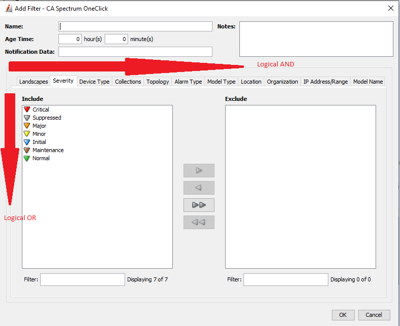 For information inside a tab, Spectrum applies a logical "OR". For example, Critical OR Major OR Minor etc.
