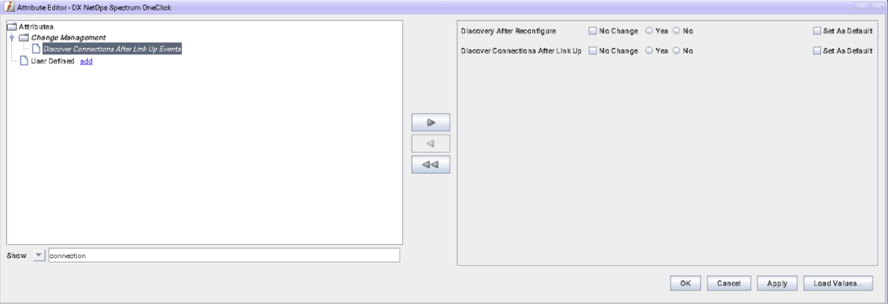 DeviceDiscAfterReconfig (0x11d27) - Determines if SPECTRUM should update its knowledge of connections off a device's interfaces after a reconfiguration occurs. If "Discovery After Reconfigure" is set to Yes/True, it will trigger device connectivity mapping after the device model is reconfigured. Device discovery will read information from the IP MIB, Bridge MIB, and in some instances, vendor specific mibs such as the Cisco Discovery Protocol MIB. Default value "No/False".