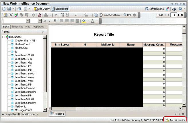 Whenever you run any report containing more than 5000 records, the Infoview displays only the first 5000 records and displays an alert showing Partial results as shown in the figure below. To enable viewing of the complete report of the managed object, you need to perform some settings in the BusinessObjects designer.