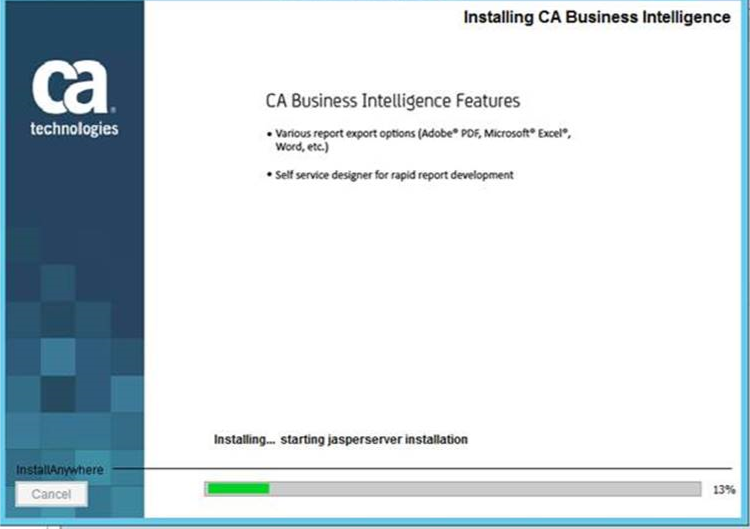 At the following stage during the install (screenshot below), JasperSoft install on Windows hangs at 13% and does not progress any further.