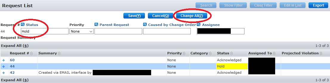 In the above example, we see that a status change of "Hold" has been applied to Request #44. If you were to click "Change All", this will apply the same change across ALL search results depicted. It will not differentiate across entries and will apply the change equally across all search result entries.