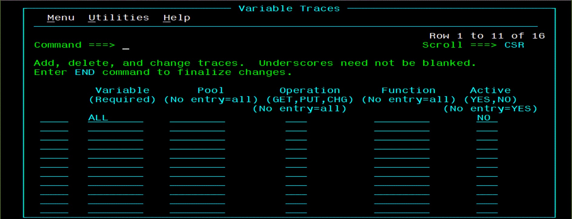 Select Variable Trace, and specify ALL for "Variable" and YES for "Active" <PF3>. <PF3> again out of Traces.
