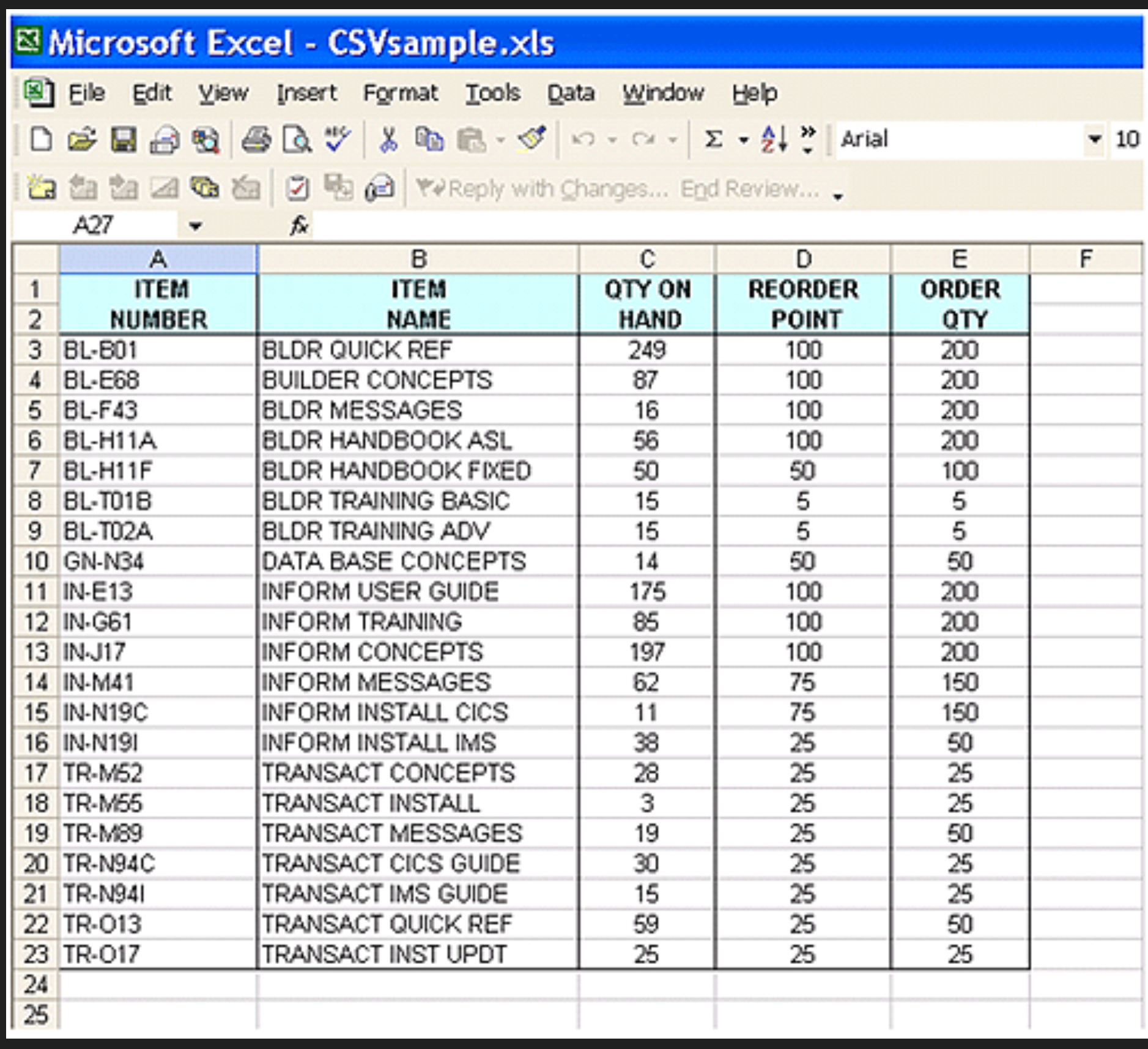 ITEM,ITEM,QTY ON,REORDER,ORDER NUMBER,NAME, HAND, POINT, QTY BL-B01,BLDR QUICK REF,249,100,200 BL-E68,BUILDER CONCEPTS,87,100,200 BL-F43,BLDR MESSAGES,16,100,200 BL-H11A,BLDR HANDBOOK ASL,56,100,200 BL-H11F,BLDR HANDBOOK FIXED,50,50,100 BL-T01B,BLDR TRAINING BASIC,15,5,5 BL-T02A,BLDR TRAINING ADV,15,5,5 GN-N34,DATA BASE CONCEPTS,14,50,50 IN-E13,INFORM USER GUIDE,175,100,200 IN-G61,INFORM TRAINING,85,100,200 IN-J17,INFORM CONCEPTS,197,100,200 IN-M41,INFORM MESSAGES,62,75,150 IN-N19C,INFORM INSTALL CICS,11,75,150 IN-N19I,INFORM INSTALL IMS,38,25,50 TR-M52,TRANSACT CONCEPTS,28,25,25 TR-M55,TRANSACT INSTALL,3,25,25 TR-M89,TRANSACT MESSAGES,19,25,50 TR-N94C,TRANSACT CICS GUIDE,30,25,25 TR-N94I,TRANSACT IMS GUIDE,15,25,25 TR-O13,TRANSACT QUICK REF,59,25,50 TR-O17,TRANSACT INST UPDT,25,25,25