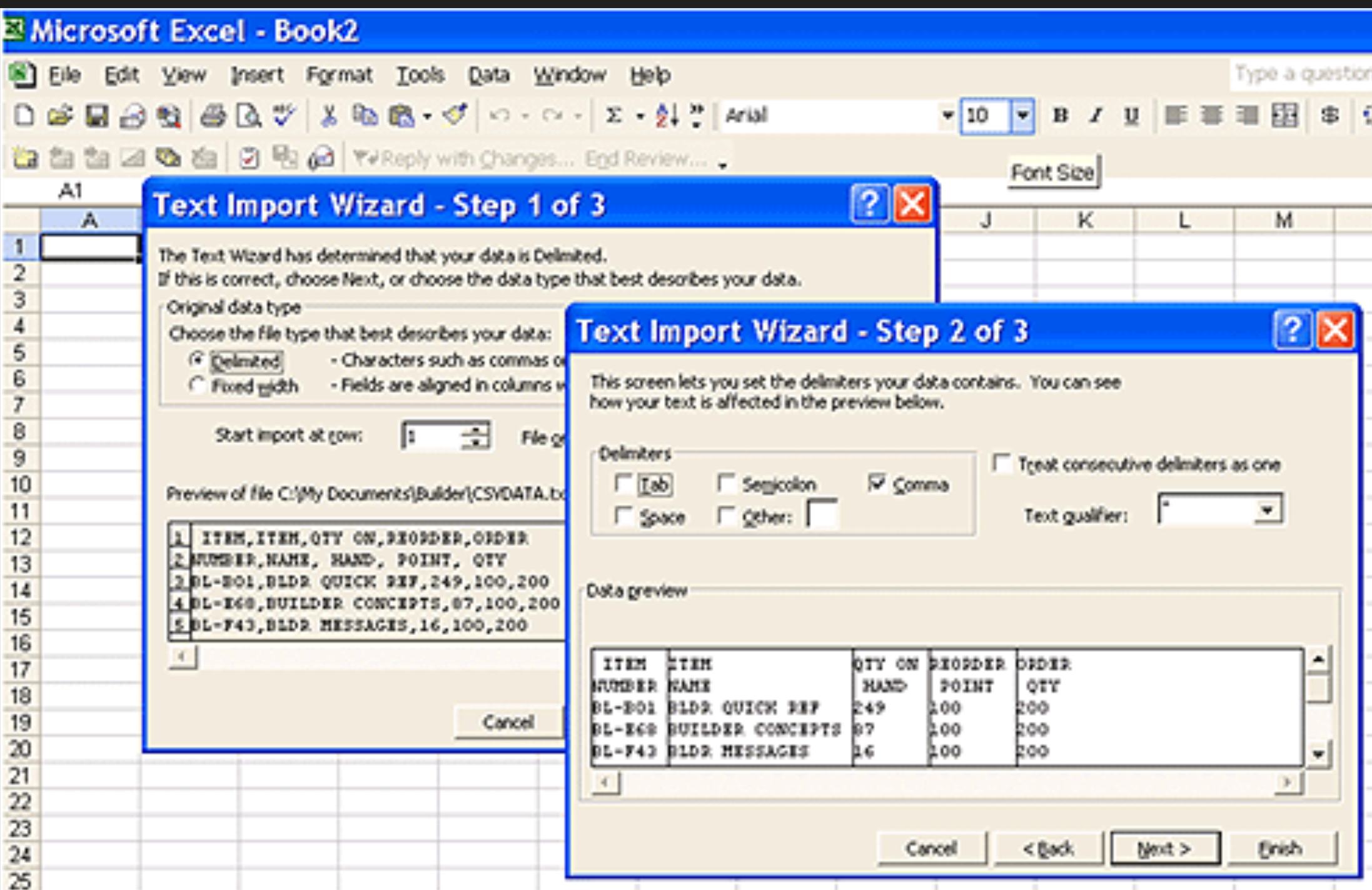 Import the downloaded CSVDATA.txt file into Microsoft Excel using the Text Import Wizard feature under Tools.