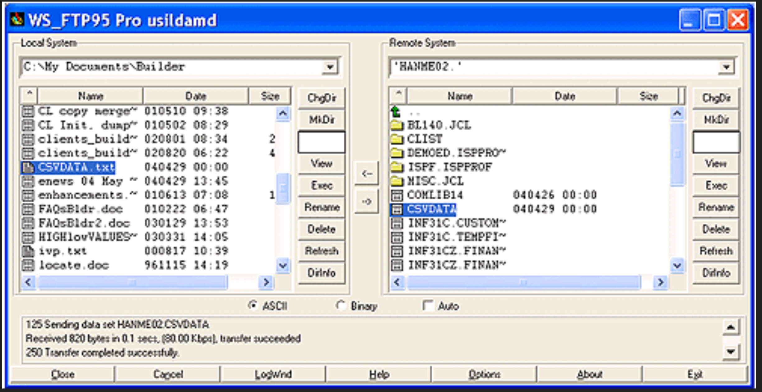 Target file, CSVDATA.txt, is specified under Local System and source file, CSVDATA, is specified under Remote System: