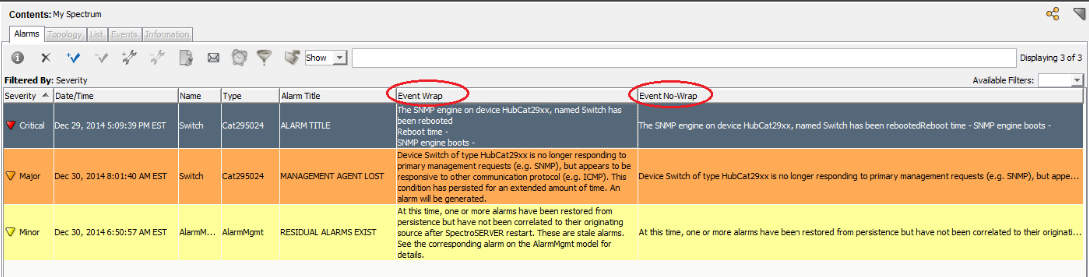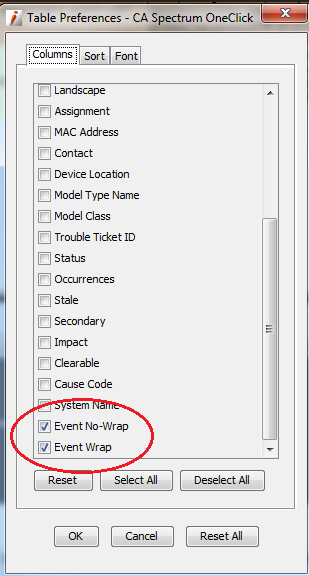 When displaying the Event column in the Alarm tab of CA Spectrum OneClick, sometimes the event has several lines of data which causes the column to take up most of the view. This tech doc will show you how to disable the word wrap in the Alarms tab Event column in Spectrum OneClick.