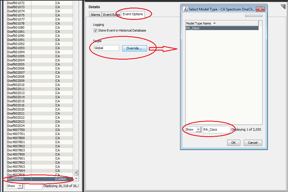 In CA Spectrum, I would like to configure an event to generate an alarm if the Model Type of the model is Rtr_Cisco (for example). For all other models, for the same event, only log an event.