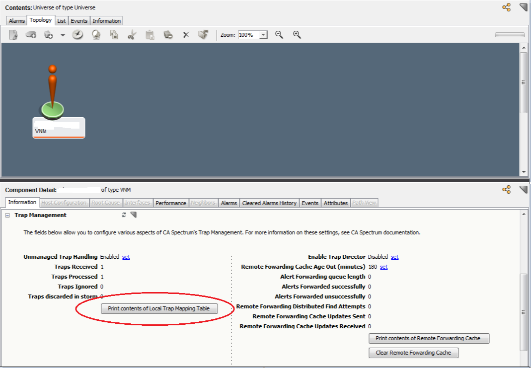 The "Dumping alert manager PIM table" message is seen when a user clicks on the "Print contents of Local Trap Mapping Table" button in the Trap Management subview in the Information tab of the VNM model.