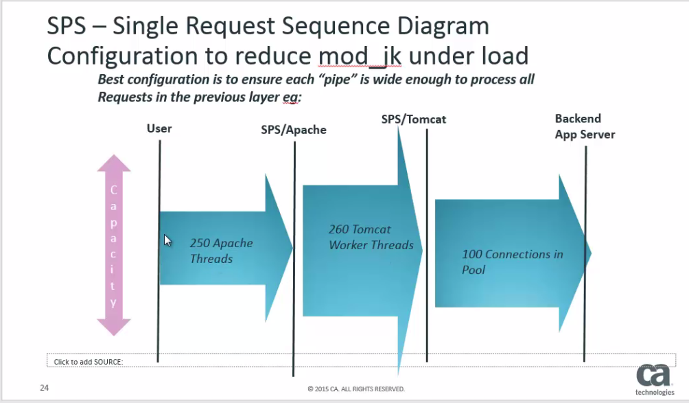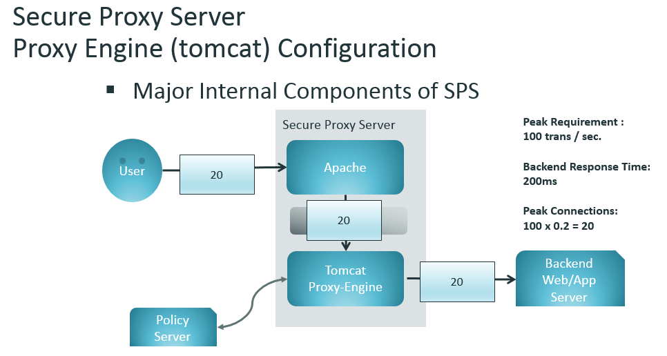 If we have requirement for 100 request/sec, and the back-end response time is 200ms, then the bandwidth in connection/threads we will need is to be able to handle about 20 requests in parallel. So we will need: 20 httpd worker threads in apache; 20 connections via mod_jk from apache to tomcat; 20 worker threads in tomcat; and 20 connections to the back-end server. Note the SPS is mostly not doing any activity, rather of the elapsed 200ms most of the time the threads are inactive waiting for the response from the back-end server.