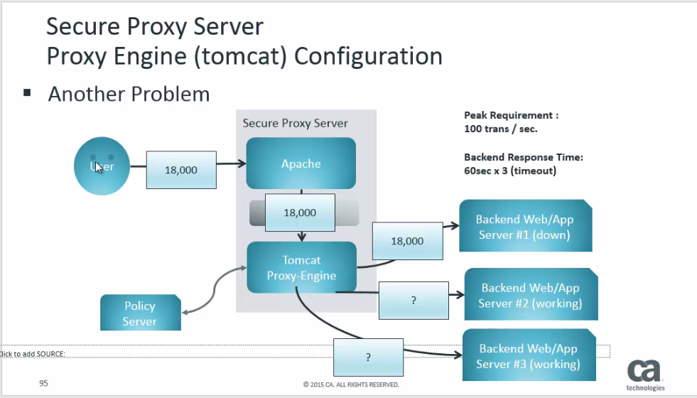 Ultimately if we get to a stage where the back-end server is down, then for the original 200 request/sec load, then (with the default settings, of a 60sec timeout and a 3x retry) we are faced with each transaction taking 180sec before it sends it's failure response back to the client.