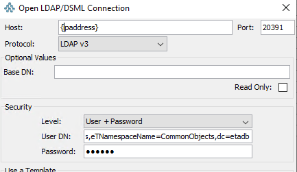 2. Use an ldapbrowser to connect to the Provisioning Repository router (i.e. data later) which is running on the Provisioning Server machine and listening on port 20391 using: