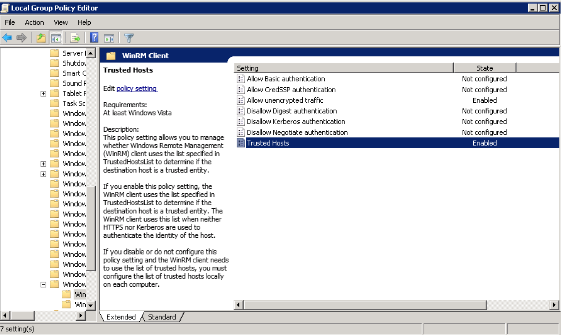 Then these steps must be followed to add the local policy permissions to allow the "Allow Unencrypted and Trusted Hosts"