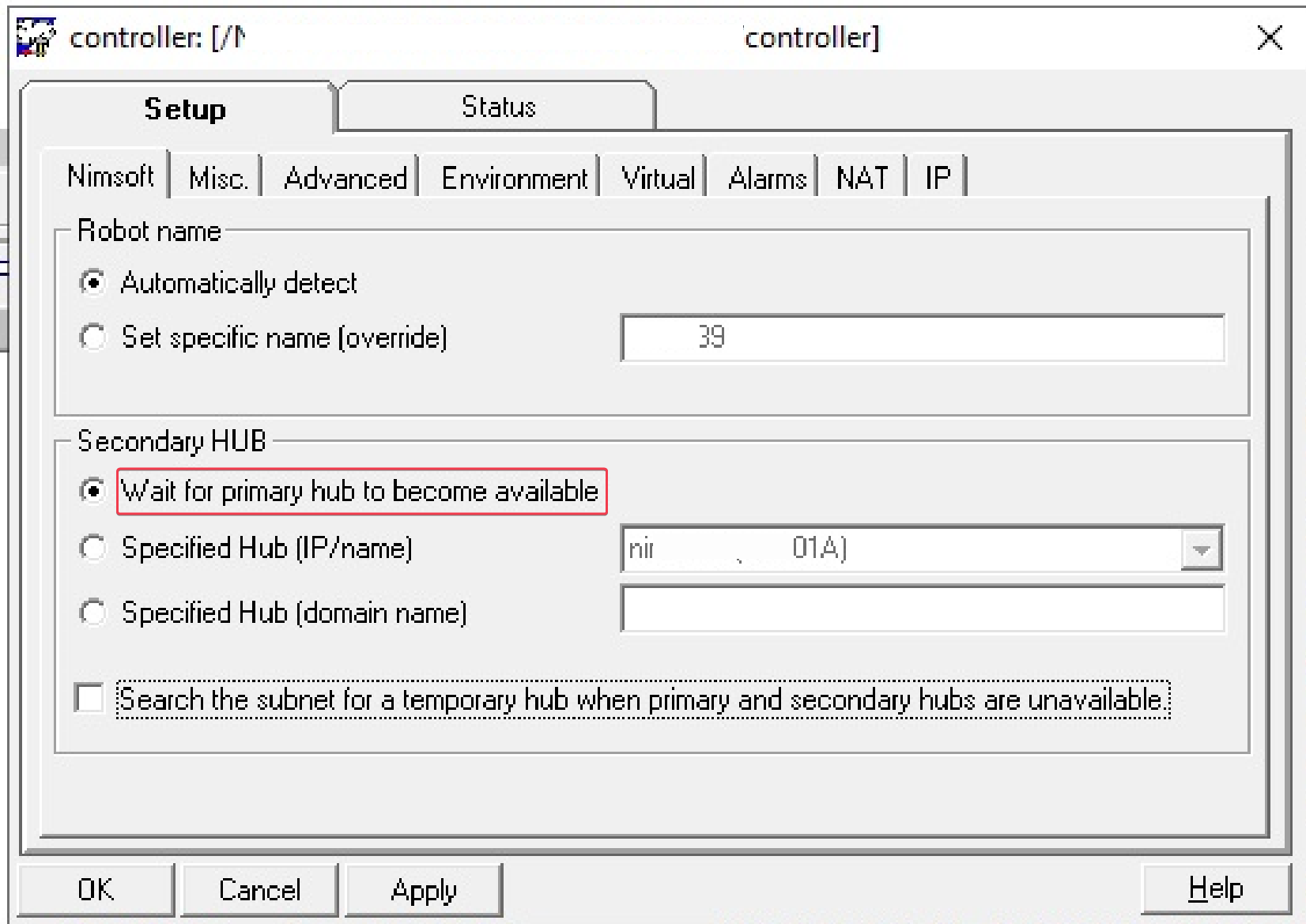 If I open a controller GUI the Nimsoft tab\Secondary HUB area, "Automatically detect..." is selected by default.