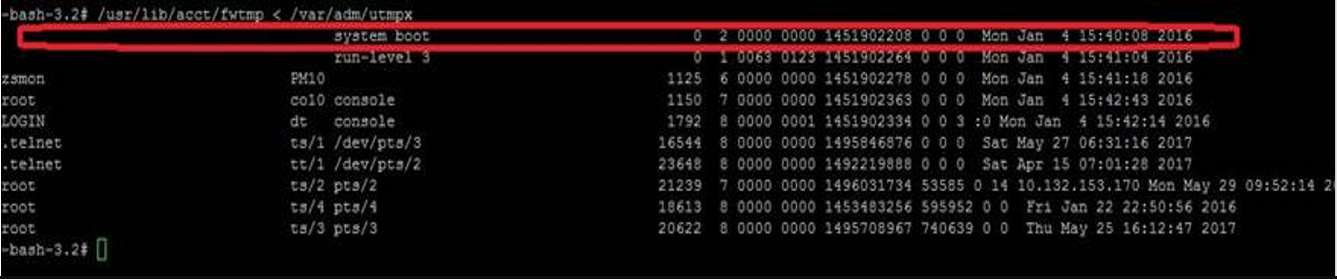 2./usr/lib/acct/fwtmp < /var/adm/utmpx