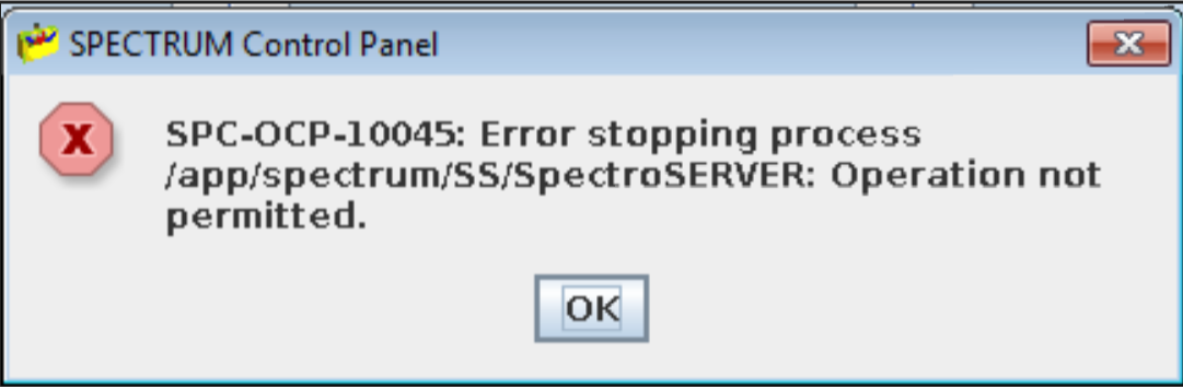 When trying to stop the SpectroSERVER using the Spectrum Control Panel, the following error is seen: