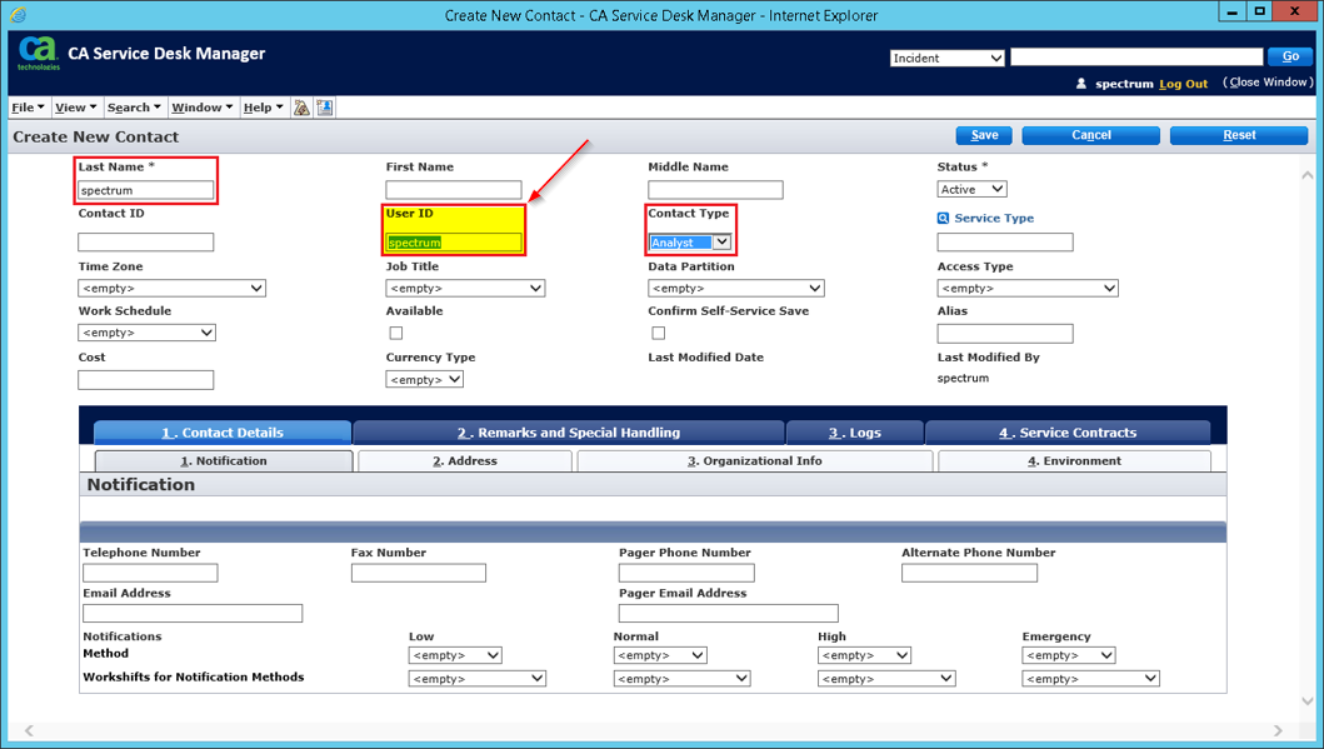 The "User ID" field is not filled in for the special CA Spectrum contact created in the CA Service Desk Manager.