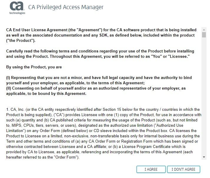 The License Agreement page is not accessible via the CA PAM Client, so in order to fix this someone will need to visit PAM from a web browser. When visiting PAM for the first time from a web browser the license agreement will show up. First the license agreement should be read, then if you agree with it click "I Agree".