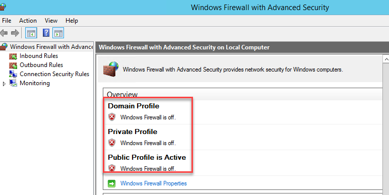 Administrative Tools->Windows Firewall with Advanced Security and making sure it says that is is "Off" for for Domain Profile, Private Profile, and Public profile as in the screenshot below: